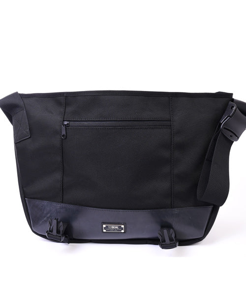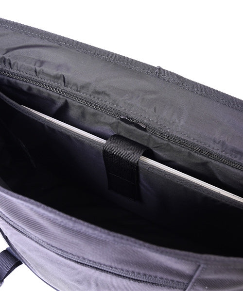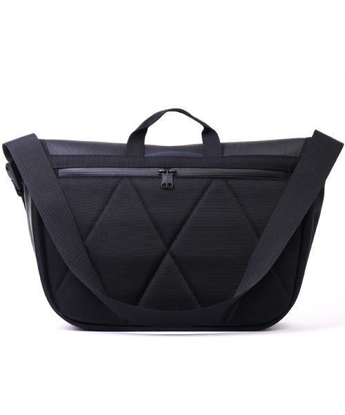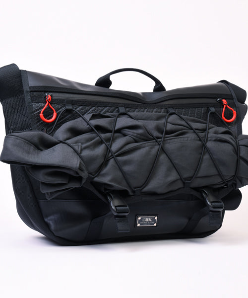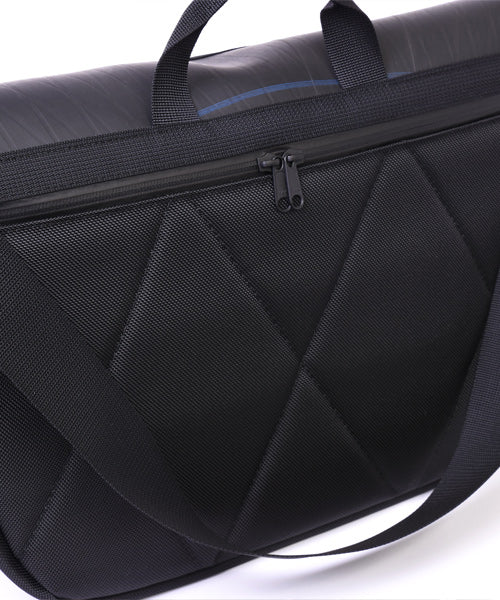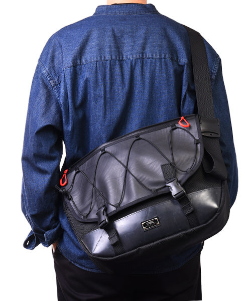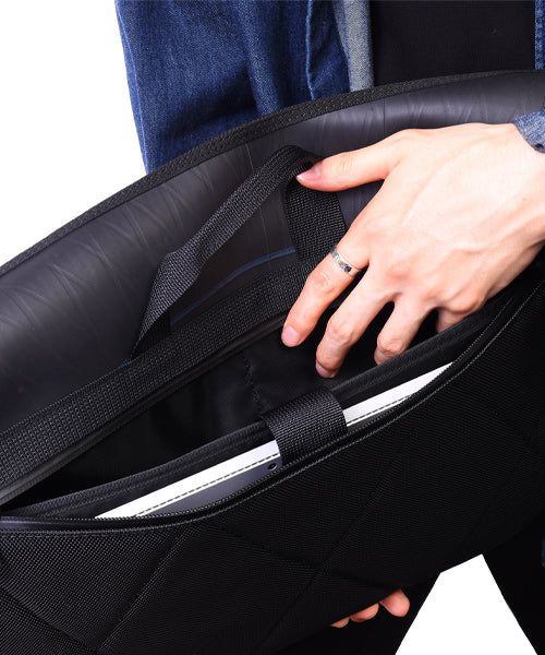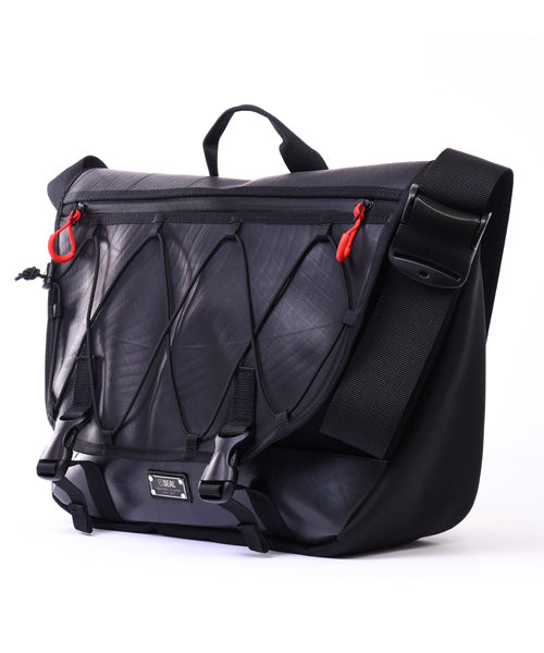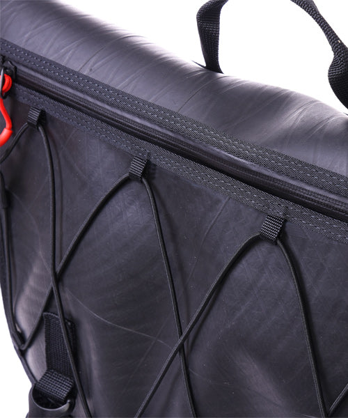 Watertight zippers and high-strength water-repellent nylon. High waterproof performance is achieved by effectively combining them with tire tubes. Elastic cord on the surface. It can be replaced with the attached color cord or removed, of course. The elasticity makes it convenient for holding clothes, newspapers, towels, etc. The main compartment is large enough to hold A4 files with ease. In addition, it has a cushioned pocket for a PC and two pockets for small items. It is designed to be functional while also being easy to use. The back of the bag is equipped with a zipper for direct access to the interior. You can take things out without opening the flap. The shoulder belt has a cam buckle for one-touch length adjustment.