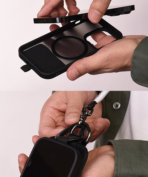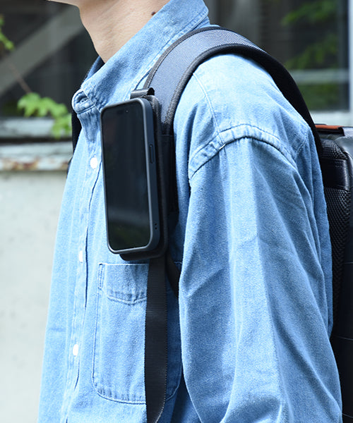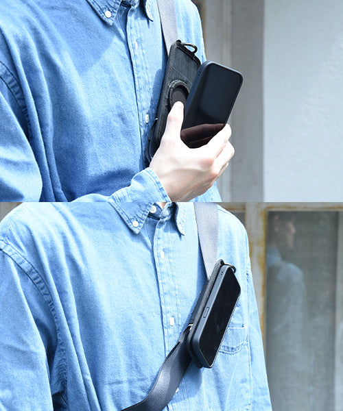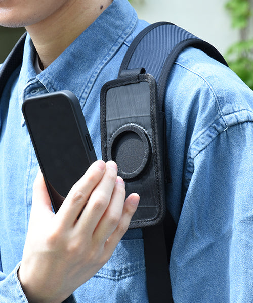 The "Multi-Flex Gear for Smartphones" compatible with MagSafe is now available, offering a completely new way to use your smartphone. Your smartphone's MagSafe is connected by the powerful N52 grade magnetic force, the highest magnetic force available, employed on the front of the product. By attaching it to a backpack or shoulder bag using the belt holder on the back, you can instantly attach and detach it in a single action, an unprecedented item.