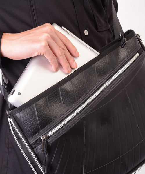 The expandable model in the Sakosh bag is now available in a Night Ride model that makes nighttime travel safer. The main compartment has an expansion function of approximately 6 cm, allowing it to cope with an increase in luggage without problems. The front surface is made of tire tube material that is both waterproof and impact resistant, while the back surface is made of BEATTEX, a new material developed by Shinko Co. The bag can hold up to A4 size despite its thin gusset, and it fits snugly to the body, making it very easy to use in active environments. The simple, easy-to-use design weighs only 450 grams. The tire tube surface material gives each item a unique look, making it a truly one-of-a-kind product.