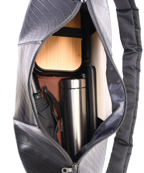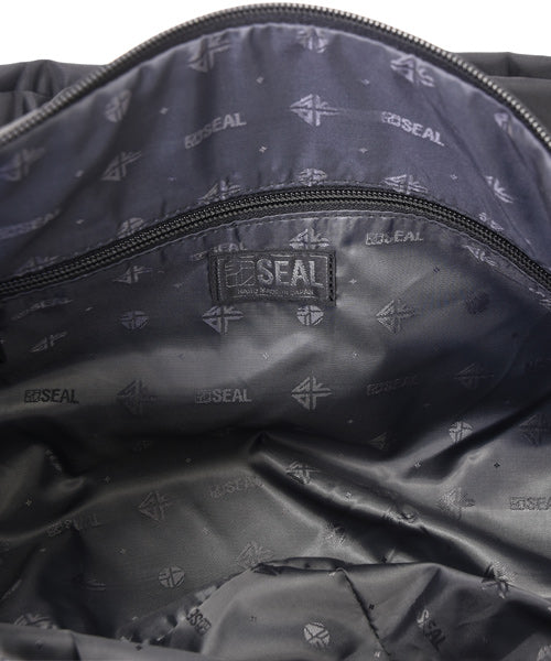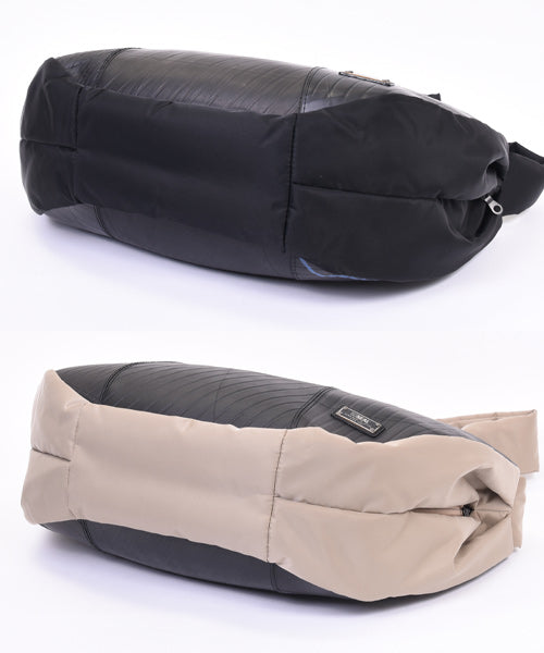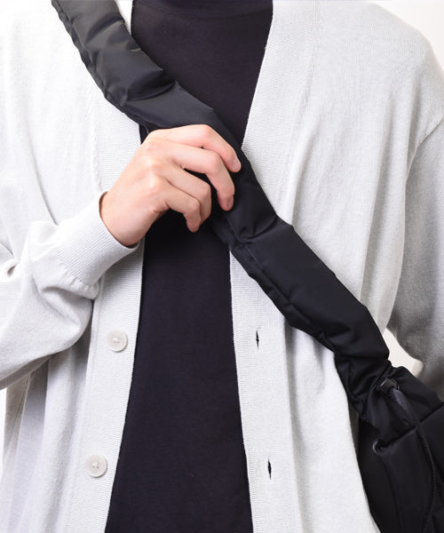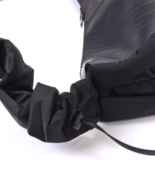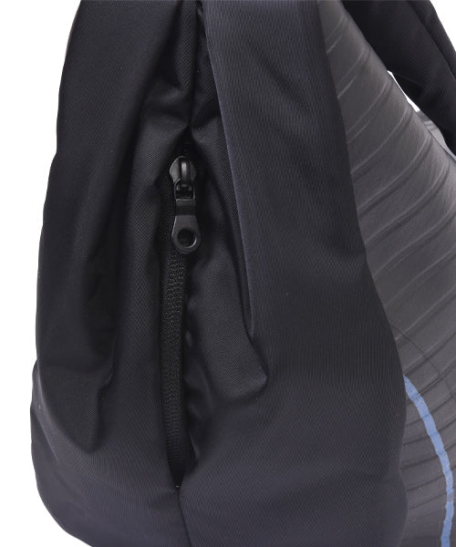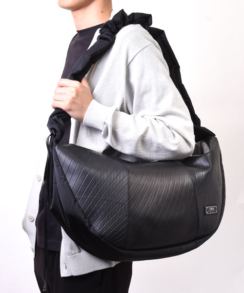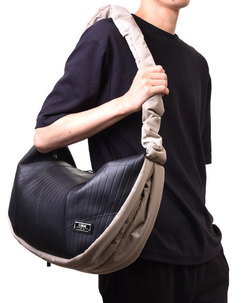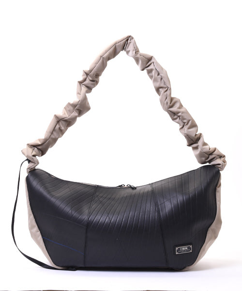 A 3-way shoulder bag combining a trendy half-moon shape with a shirring shoulder strap. The shoulder section features an adjustable drawstring for length customization, allowing versatile use as a handheld, shoulder bag, or crossbody bag to suit your style. Its beautiful drape and wrinkle effect achieve both fashion and functionality. The main body uses durable tire tube material resistant to water and stains. The nylon sections feature eco-conscious fabric made from recycled nylon yarn sourced from recovered fishing nets and clothing, offering a beautiful sheen and soft texture. The interior employs SEAL's original jacquard fabric, showcasing meticulous attention to detail. Ample storage is another key feature. Its rounded form, achieved through three-dimensional cutting, offers surprising capacity beyond its appearance, easily holding A4-size documents, a 14-inch laptop, a folding umbrella, and a tumbler. Inside, a large zippered pocket is provided. Additionally, a hidden pocket on the outer side is perfect for storing your smartphone or keys. Its unisex design suits both men and women, making it versatile for commuting, school, or weekend outings. Combining shirring design with functional beauty, this new staple bag also serves as a stylish accent.