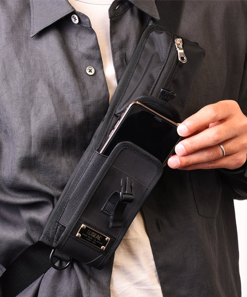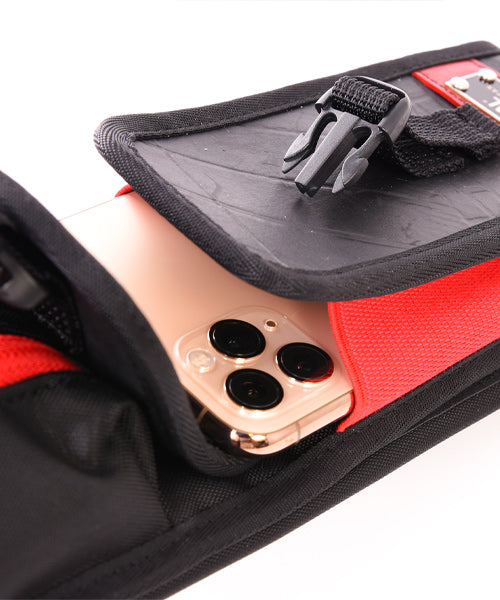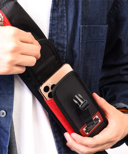 A new style of shoulder pad that not only reduces the burden on the shoulder, but can also be stored. Simply attach it to your regular bag to customize it to a higher rank. The mobile compartment is made of stretchable material and is fully compatible with large size smartphones. The zipper pocket can be used freely. A large amount of cards can be stored. Compatible with belts of all sizes, from thick belts of about 50mm to thin belts. The back of the bag is made of mesh material to prevent heat buildup and ensure comfortable use. Thickly padded to absorb any shock.